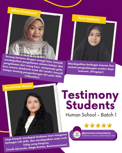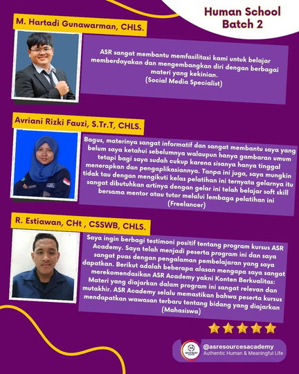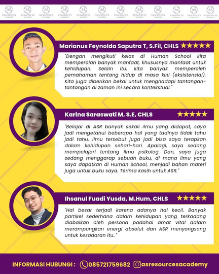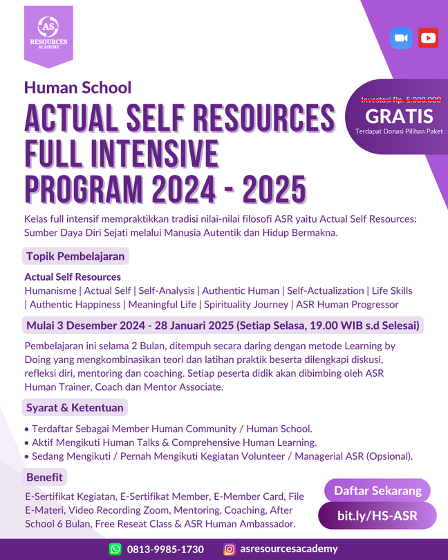 Kelas full intensif 6 bulan memprakktikan tradisi nilai-nilai filosofi ASR yaitu Actual Self Resources: Sumber Daya Diri Sejati melalui Manusia Autentik dan Hidup Bermakna.